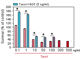 Purified cultures of sensory neurons are injured by chemotherapeutic drugs (cisplatine 3 µg/ml, vincristine 7.5 ng/ml or taxol 0.5 µg/ml). The aim of this study is to investigate the putative protective effect of tested compounds on this damage. Neuronal survival is assessed by measuring acid phosphatase activity after exposure to chemotherapy and tested compound. -