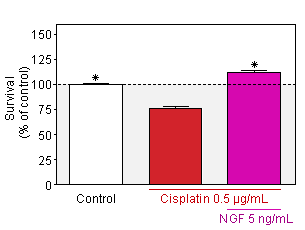 Cisplatin induces cell death in embryonic sensory neurons and Schwann cells co-culture. NGF at 5 ng/ml is able to protect neurons against the cisplatin damage.