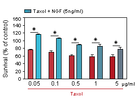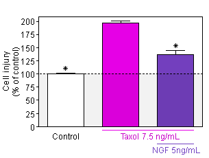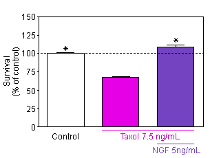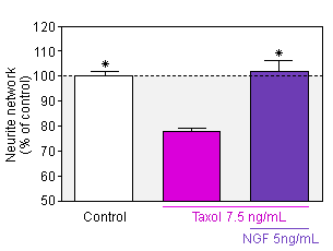 Neurite network - Taxol induces cell death and destruction of neurite network in sensory neurons and Schwann cells co-culture from rat embryos. NGF at 5 ng/ml is able to protect neurons against the cisplatin damage.
