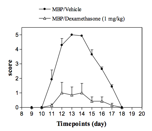 EAE is a commonly used animal model that in several respects mimics human MS. EAE is induced in female Lewis rat by injected in the hind footpad with an emulsion of MBP (myelin basic protein) in complete Freund's adjuvant containing heat-inactivated mycobacterium tuberculosis (strain H 37 RA). A daily scoring is use to evaluate neurological disease progression.