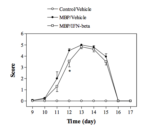 The increasing score indicate a progressive illness of rat due to MBP intoxication. These graphs show effect of dexamethasone and INFbeta on disease progression.