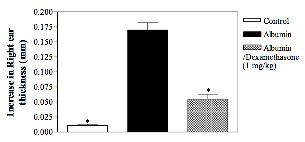 The ear swelling induced by albumin is reduced by a dexamethasone treatment.
