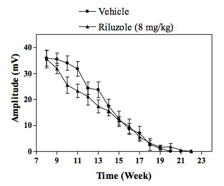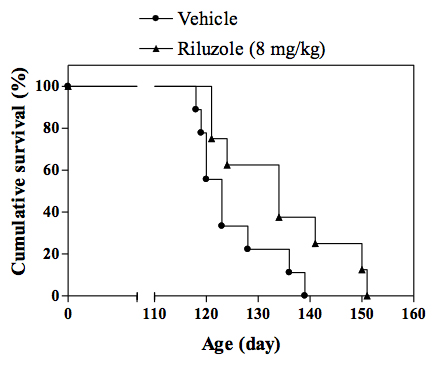 In vivo SOD1 mouse model of familial ALS :Transgenic mice overexpressing the mutant human form of SOD1 is widely recognized to rapidly develop progressive motor neuron disease that strongly resembles to ALS. At about 2.5 - 3 months of age SOD1 mice demonstrate progressively muscle weakness along with nerve dysfunction indicated by a decrease in the amplitude and an increase in latency of compound muscle action potential (CMAP). By 4 months of age, death by paralysis and respiratory failure appears. In the clinic Riluzole shows a modest extension of survival, but no effect on motor function, and a similar profile is observed in SOD1 mice following chronic treatment with riluzole. For drug screening, compounds are given chronically (typically starting at day 60 of age) and their effects in the SOD1 mice are evaluated by measuring: survival or survival and nerve function (electrophysiology measures) or survival, nerve function and motor performance (behavioural measures).