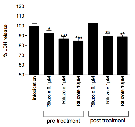 In Vitro Survival assay :A number of findings support the role of glutamate excitotoxicity in the ALS pathophysiology. In this in vitro survival test 13-day-old cortical neuron cultures are injured by an acute intoxication with glutamate or NMDA. Compounds are evaluated for neuroprotective effects by adding them to the culture medium either before (protective) or after (restorative) the application of glutamate or NMDA. Neuronal cell death is determined by measuring LDH activity in the media at 24h after glutamate/NMDA exposure.