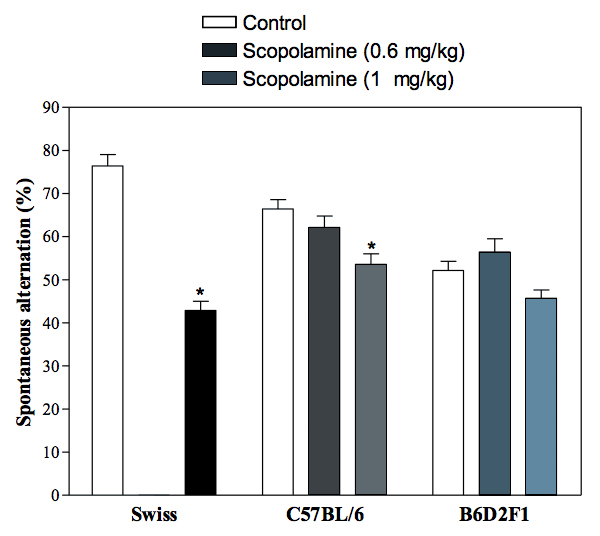 Deficits induced by scopolamine in 3 mouse strains as assayed in the T-maze. -