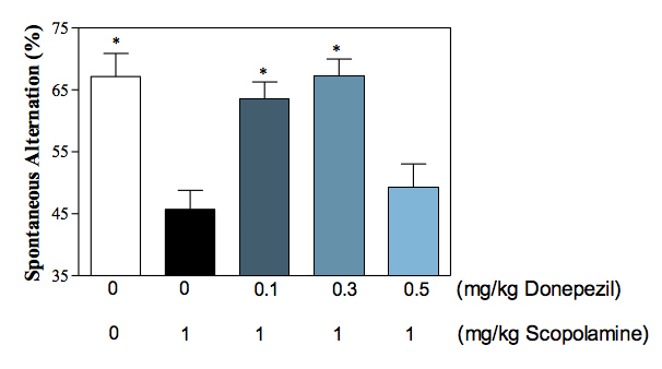 Reversion of scopolamine-induced deficit by Donepezil in Swiss mice.