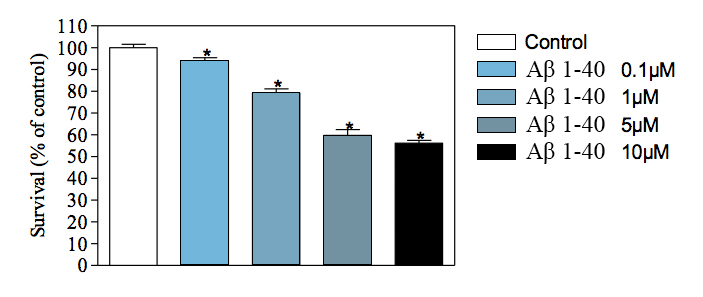 Reduced cell viability (MTT assay) in hippocampal neuron culture in response to increasing concentration of Aβ 1-40