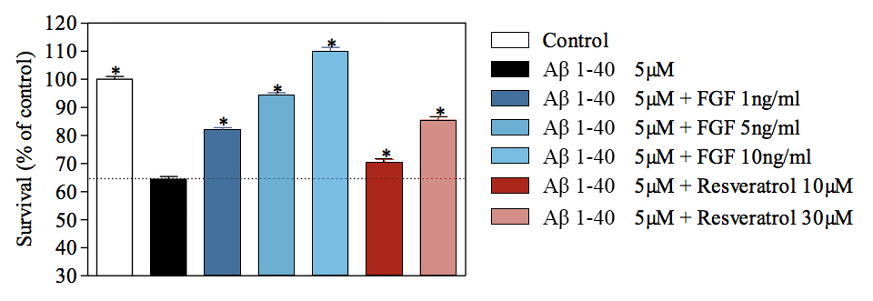Prevention of Aβ 1-40 –induced neuronal injury by bFGF or by resveratrol as assessed by MTT assay in hippocampal cultures. bFGF (or reseveratrol) is added to culture media at the same time as Aβ 1-40 *: significantly different as compared to Aβ group -