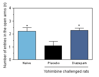 Graphs show CCK-4 (or Yohimbine)-induced panic anxiety and normalizing effects of diazepam treatment.
