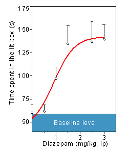 Diazepam produces a dose-dependent reduction of time spent in the lit box, suggesting an anxiolytic effect.