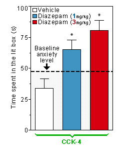 Injection of CCK-4 (cholecystokinin tetrapeptide) enhances the anxiety status of mice. The panic effect of CCK-4 is suppressed by Diazepam treatment.