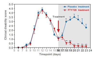 In this experimental model, the disease relapse is prevented by oral FTY720 (Fingolimod : Gilenya®), a clinically approved drug for MS.