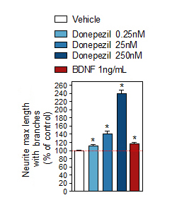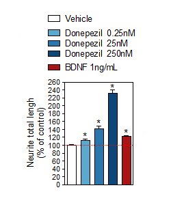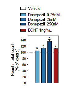 Example of the effect of treatment on neuritogenesis. BDNF is a brain derived neurotrophin; donepezil (Aricept®) is a centrally active small molecule used in the treatment of Alzheimer’s disease and different cognitive disorders