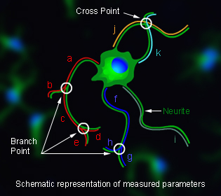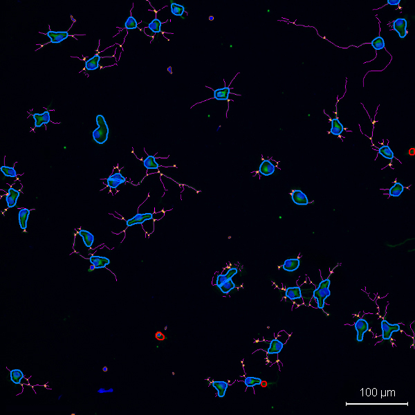 Neuronal cytoplasm is circle in blue, neurites are outline in purple, branch point is indicated by a orange dot and red circle represents excluded object