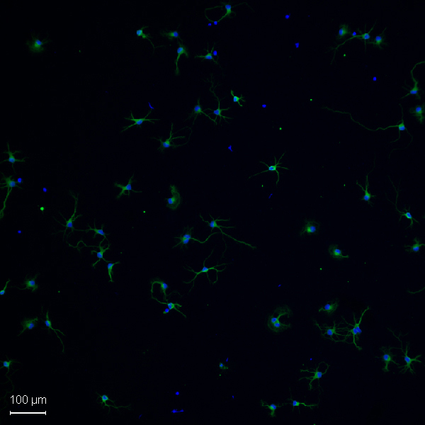 The blue colour represents the nucleus (DAPI staining) and the green the neuronal cytoskeleton (tubuline detection).