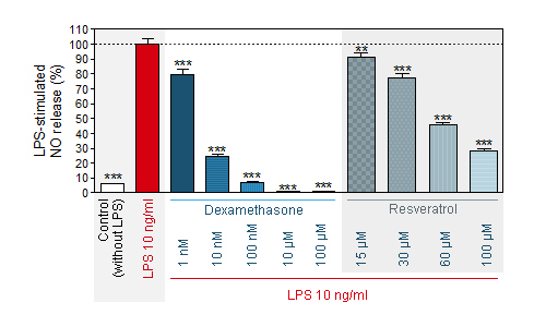 Resveratrol and dexamethasone inhibit in dose-dependent manner the NO release by LPS-activated cocultures. -