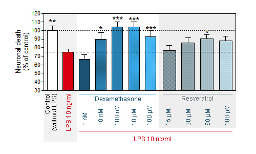 Resveratrol and dexamethasone dose-dependently inhibit neuronal death in LPS-activated cocultures. -
