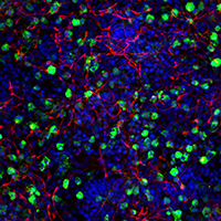 Triple immunofluorescence images of neurons (nuclei stained in blue), microglia (green),and astrocytes (red) in LPS-activated cocultures.