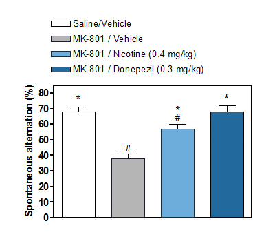 Reversion of MK-801-induced deficit by nicotine and donepezil. The T-maze continuous alternation task is used to evaluate spatial exploratory performance and working memory in mice.