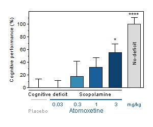 Reversal effect of Atomoxetine on cognitive deficit induced by scopolamine in the mouse. Cognitive function was assessed by the ability of mice to perform spontaneous, continuous and sustained alternation in the T-maze.