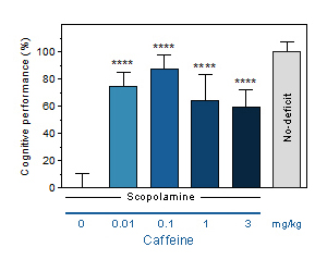 Reversal effect of Caffeine on cognitive deficit induced by scopolamine in the mouse. Cognitive function was assessed by the ability of mice to perform spontaneous, continuous and sustained alternation in the T-maze.