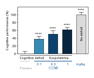 Reversal effect of CCMI on cognitive deficit induced by scopolamine in the mouse. Cognitive function was assessed by the ability of mice to perform spontaneous, continuous and sustained alternation in the T-maze.