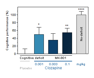 Reversal effect of Clozapine on cognitive deficit induced by MK-801 in the mouse. Cognitive function was assessed by the ability of mice to perform spontaneous, continuous and sustained alternation in the T-maze..