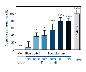 Reversal effect of Donepezil on cognitive deficit induced by scopolamine in the mouse. Cognitive function was assessed by the ability of mice to perform spontaneous, continuous and sustained alternation in the T-maze.