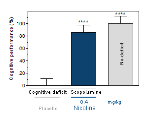 Reversal effect of Nicotine on cognitive deficit induced by scopolamine in the mouse. Cognitive function was assessed by the ability of mice to perform spontaneous, continuous and sustained alternation in the T-maze.