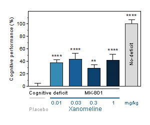 Reversal effect of Xanomeline on cognitive deficit induced by MK-801 in the mouse. Cognitive function was assessed by the ability of mice to perform spontaneous, continuous and sustained alternation in the T-maze.