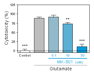 Neurotoxicity of glutamate as assessed by the extracellular release of LDH and the neuroprotective effect of increasing doses of MK-801.