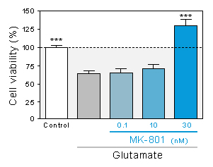 Reduced neuronal viability in response to acute glutamate intoxication and the neuroprotective effect of increasing doses of MK-801.