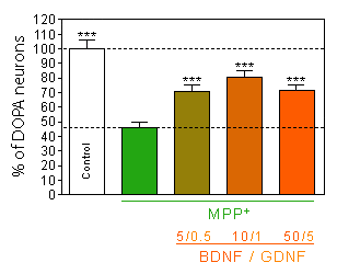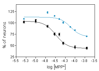 Parkinson's disease (PD) is a neurodegenerative disorder with motor symptoms caused by the death of dopaminergic (DOPA) neurons in the substantia nigra. MPP+ is the active metabolite of MPTP, a neurotoxin that causes parkinsonism in humans and animals through selective damage of DOPA neurons. Similarly to the in-vivo situation, MPP+ induces a selective death of DOPA neurons in primary cultures of rat mesencephalic brain neurons.