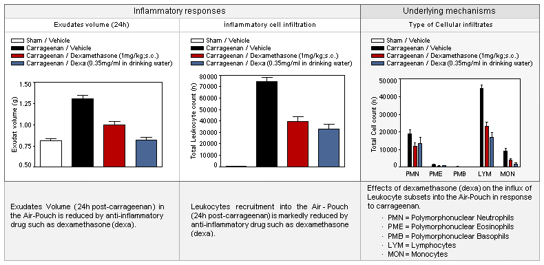 The carrageenan mouse air pouch is an in vivo model that can be used to study acute and chronic inflammation. The inflammatory reaction is characterized by an infiltration of cells and an increase of pro-inflammatory mediators.