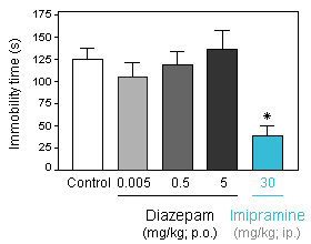 - Animals placed in a container filled with water show periods of increased swimming activity and periods of relative immobility. Clinically active anti-depressants have been found to delay the onset of the first phase of immobility and to reduce the total time of relative immobility. The list of active compounds includes monoamino-oxidase-A (MAO-A) inhibitors such as moclobemide, brofaromine, noradrenaline (NA) uptake inhibitors such as imipramine and amytryptilin, MAO-B inhibitors such as selegiline and tranylcypromine, serotonin uptake inhibitors (SSRI) such as fluoxetine and paroxetine and combined NA / SSRI such as venlafaxine. Benzodiazepines and other types of psychoactive compounds have been found to be inactive in this test.