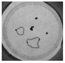 Low magnification picture from a Petri dish in which 5 explants are initially placed. 3 weeks after, 3 explants, marked with a dot, were not able to produce an efficient innervation and the 2 latter explants innervated large muscle areas which were delimited by a line.