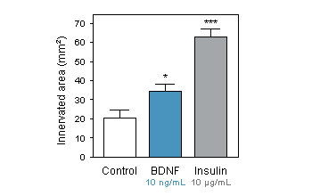 BDNF at 10 ng/mL andInsulin at 10 µg/mL increase the surface of skeletal muscle innervated by an efficient rat spinal cord-human muscle coupling.