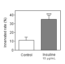 BDNF at 10 ng/ml increases the innervate rate from 20% under control condition to 25% with BDNF and augments the surface of skeletal muscle innervated by an efficient rat spinal cord-human muscle coupling. -