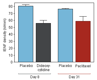 Dideoxycytidine-related neuropathyDrugs Rat strain Treatment regimen Timepoints IENF density (n/mm) sem n p-value (t-test) Placebo (Saline) Dideoxycytidine (50 mg/kg; i.v.) Sprague-Dawley