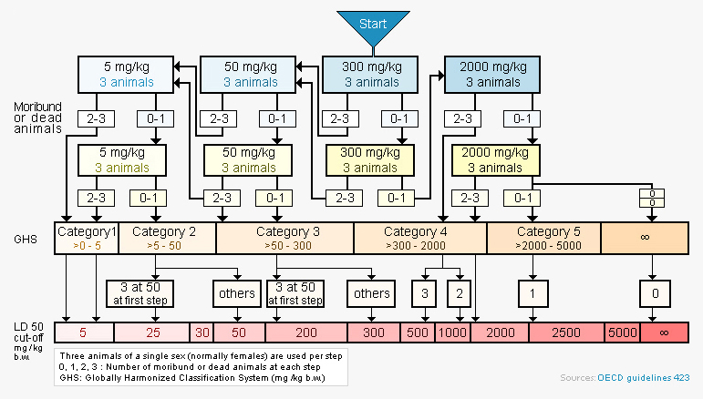 Each step in the protocol uses three animals. The absence or presence of compound-related mortality of animals dosed at one step determines the next step. Lethal exposure ranges are rapidly established and an estimation of an LD50 value can be made when at least two doses result in mortality > 0 % and < 100 %.